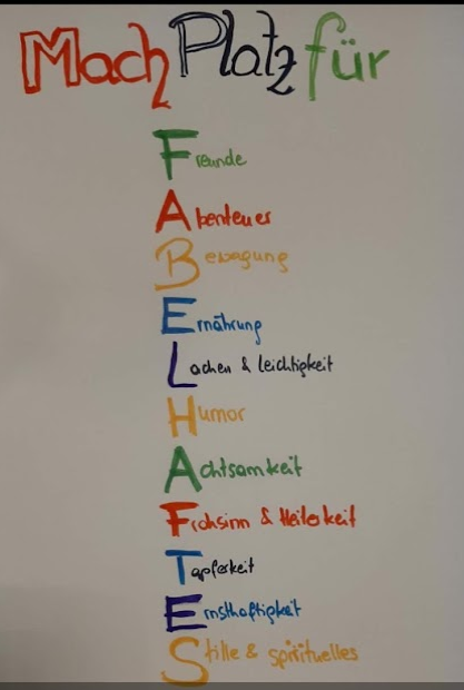 Fred, unser Trainer, wird neugierig: „Das klingt spannend, Mona, – was hast du dann zum Beispiel letzte Woche gemacht?“ Mona lacht. Letzte Woche ist echt ein ganz schlechtes Beispiel. Da war sie auf Urlaub und ist auf einem Kamel geritten. Alle lachen. Naja, so ein Kamel ist dann wohl nicht ganz alltagstauglich zum Nachmachen stellt die Runde fest. „Stimmt,“ sagt Mona, doch es geht auch anders: „ein neues Buch lesen, die gewohnte Spazierrunde mal in die andere Richtung gehen oder … einmal hab ich zum Beispiel auch das erste Mal Schafgarbentee getrunken. Die Schargarbe wächst vor meinem Haus, der Tee war gleich gemacht. – Alles ganz easy. und wenn mal als Highlight ein Kamel dabei ist, ists natürlich fein!“